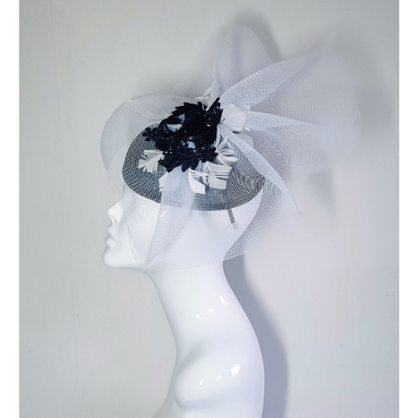 This Mono Fascinator is a classic shape on the asymmetrical placement Ideal for any wedding guest ho wants to ad height and look stunning in black and white. Wedding events or a Day at the races will guarantee heads will turn with this modest but effective style of fascinator.