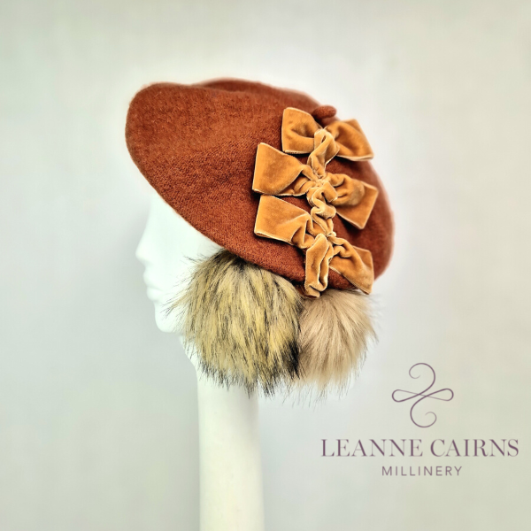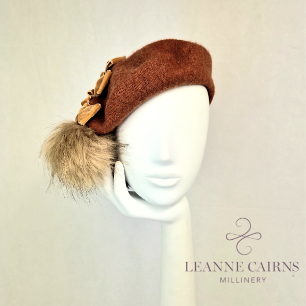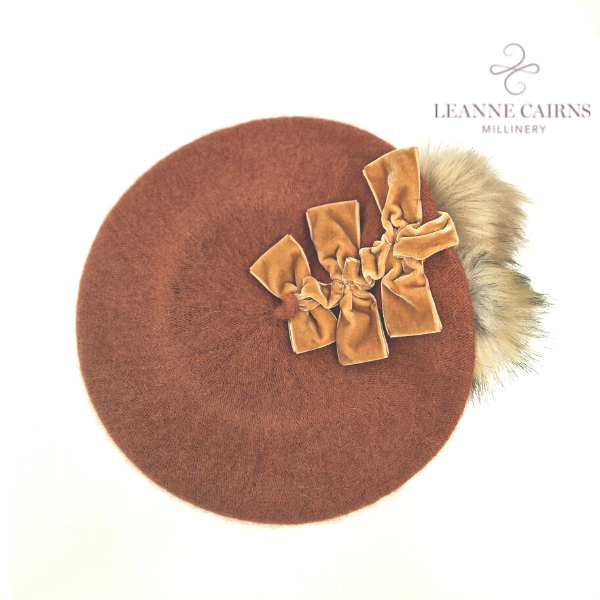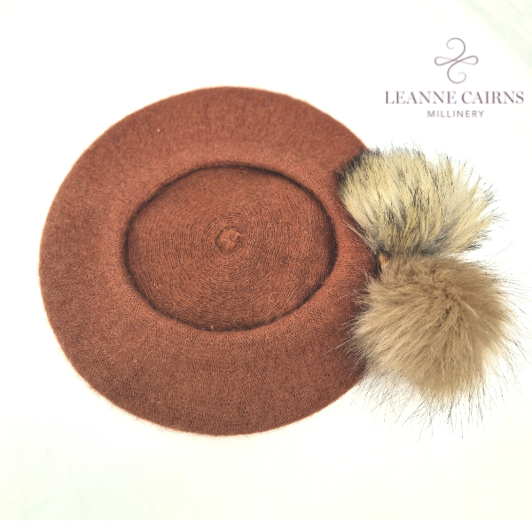 Keep cosy with our winter warmer, 100% Wool French Beret Hat in Cognac colour with unique hand sewn luxurious velvet ribbon detailing / faux fur pom poms in tones of caramel creates versatility in wearing for different looks each time you wear. Can be worn casual smart or dressed for any occasion to keep your head warm. Perfect Christmas gift.